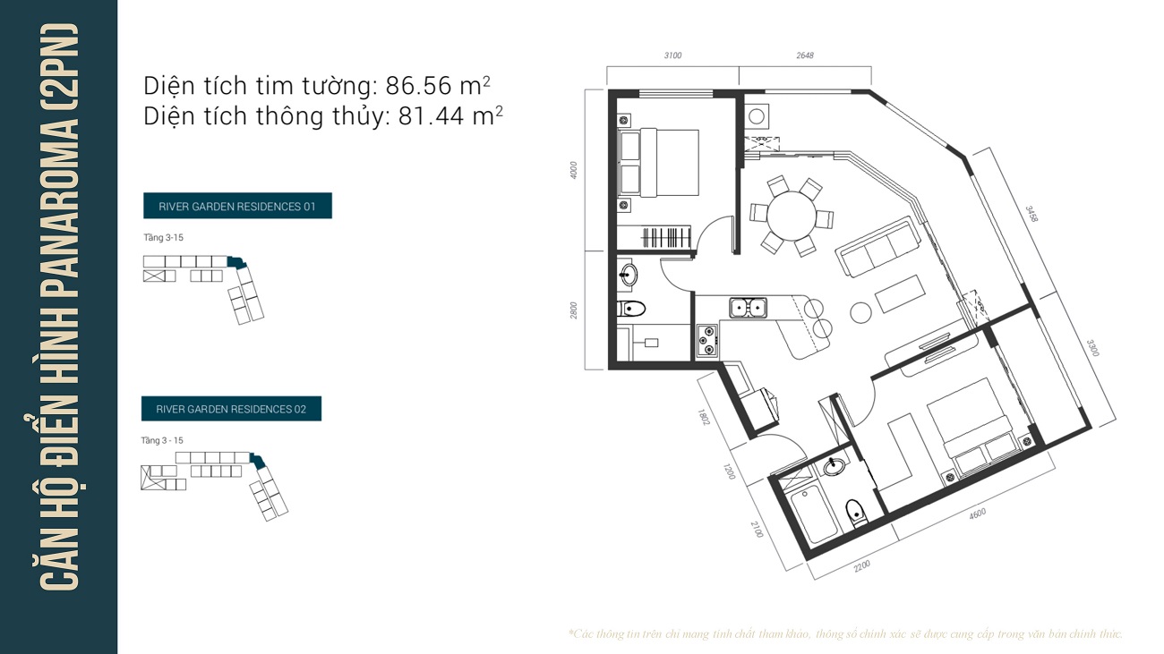 – Các loại căn hộ: 1PN: 45m, 2PN: 65m, 2PN loại panaroma: 86m, 3PN: 104m2.