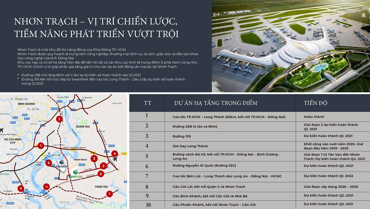 Theo đánh giá của các chuyên gia, tầm nhìn tới 2030 trong lĩnh vực quy hoạch hạ tầng và phát triển đô thị, thì Nhơn Trạch là 1 điểm sáng nhất trong tất cả các khu vực lận cận TP HCM. Bởi, Nhơn Trạch có vị trí đẹp, tiếp giáp với các quận Q9, Q2, Q7, Nhà Bè, Cần Giờ và tiếp giáp với công trình quốc gia như Sân Bay Quốc Tế Long Thành, Cảng Quốc tế Cái Mép Thị Vải.